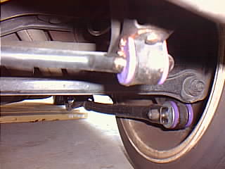 この紫色のがPOWERFLEXです。付けた感想ですが、うちのデルタは足が硬めなんで、徐行、街乗り、高速走行で常にピョンピョンというかビョンビョンという感じで跳ねてました。それが徐行の時は跳ねなくなって、それ以外ではガツンガツンって感じに跳ねる感触が堅くなりました。かなり足がしっかりしたようです。 |