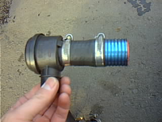 純正のアッパーホースに付けたところ。純正のブローオフの入り口は25mmで、GREDDYのブローオフに付属してるインプレッサ用の入り口は20mmとサイズが違うので、水道関係の25mmから20mmに変換する部品を使ってつなげました。 |