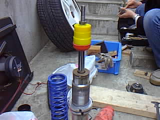 リアの車高調にもバンプラバー付けました。POWERFLEX(黄色)のだけだとちょっと短いようだったのでうちの有った赤い短いのを足しました。