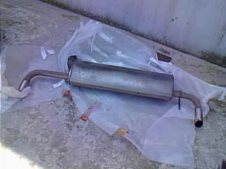 | 外した後の純正マフラー。結構綺麗だったけどタイコの裏側には凹みが。 |
