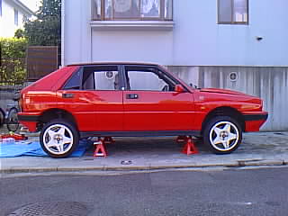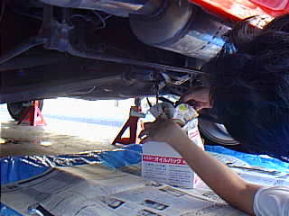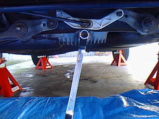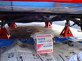リア側の作業はジャッキアップしなくてもできる事もあるんですが、今回は作業スペースが必要なのでリジットラックで上げました。 |
