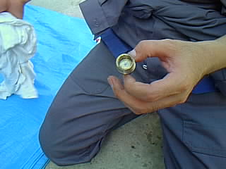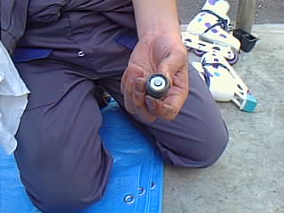 最初に注入口のボルトを17/19のレンチで外します。 |