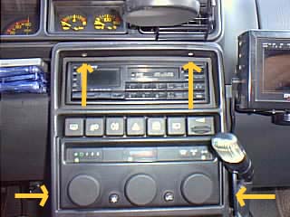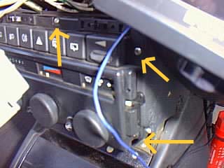 次にスイッチパネルを外します。 矢印の所と、運転席側にもある2カ所のネジを外します。 温度調整と吹き出し切り替えのノブの裏から、空調ユニットの方へ繋がってるバーとジョイントに気を付けながらパネルを外します。 |