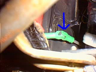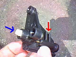 青矢印がスイッチ部分、赤の所に2本のバキュームホースが刺さります。 スイッチを押すことによって、2本のホースにエアーを通したり止めたりしてます。 取り付けは逆のことをやって元に戻して終わりです。 |