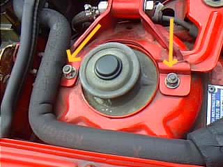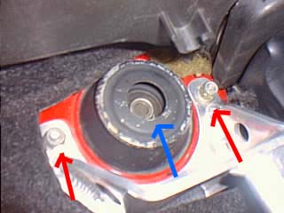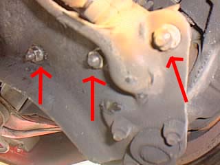 作業はフロントからやりました。ジャッキアップして矢印のナット(13mm)を外します。どちらか片側1つは緩めとくだけにします。 |