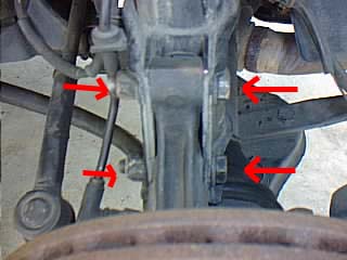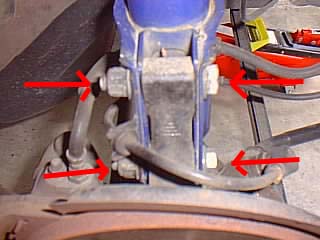 戻すときはショックをアッパー部分をはめ込んで2個のナットを仮留めし、ハブを足で持ち上げながら固定ボルトを刺して締めて、ABSセンサ、コードなど外したものを元に戻せばおしまいです。 |