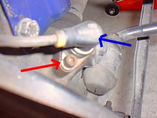 ABSセンサを外します。赤矢印のヘキサボルトを外します。その後青矢印のセンサ部分を引っこ抜きます。中が錆びたりして抜けにくいので、CRCをかけてドライバーとハンマーで小突いて何とか抜き取ります。 |