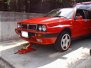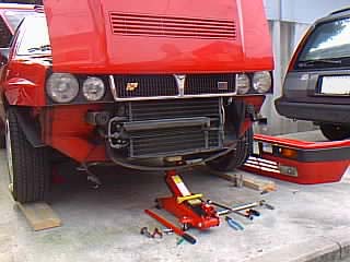 ウインカーとフォグランプの配線を外す必要があるのでジャッキアップします。 |