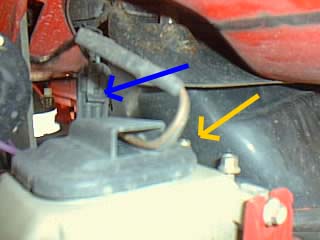 青い矢印がウインカーの防水コネクタで外します。フォグはコネクタが見あたらなかったので、フォグランプ裏の黒いカバーを外します。黄色矢印の所の+ネジを外せば取れます。 |