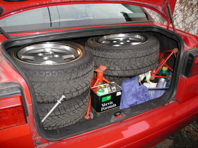 | こあ2号に付いてたタイヤがそのまま155のトランクに収まってしまいました。そのほかにウマとかオイルの4L缶とか色々入ってます。スゴイ収容能力ですね。 |