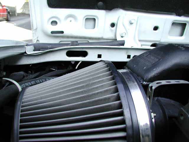 そのまま付けるとエンジンルームから上にはみ出てしまうので、ホースを少し下に押し込んであります。