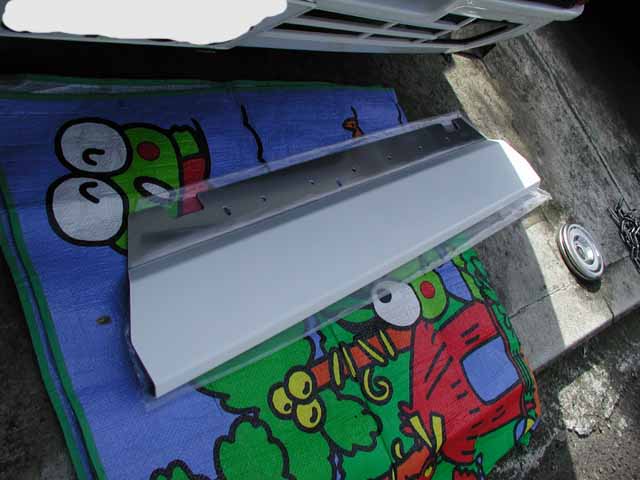 休日出勤が続く中で、出社前にちょこっとSL寄ったら、リップガードが安く売られてたので買ってしまいました。どうせ付けるならワークスは確か先は白かったし、ボディ同色の方が格好いいかなーと思って、表になるところだけ色を塗りました。色はホルツの特注色でFIAT用の白です。一応ウレタンクリアも吹きました。