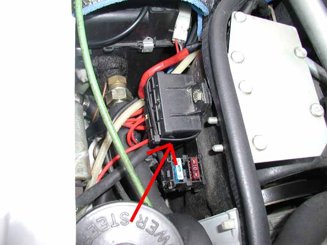 「+」のケーブルは矢印のところの黒い箱の中に集めました。かなり詰まってます。ここから室内を通してトランクまでケーブルを引っ張りました。ケーブルの太さは22sqです。 |