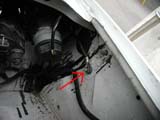 バッテリーに繋がってた「−」ケーブルを矢印のところの塗装を剥いで付けました。 |