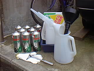 これがお道具一覧。今回初めてなのでATFオイルを8本用意。でもこれがなかなか安くで近所でいっぺんに買い集められなくて結局2週に渡って買いに行きました。パワステくらいしかみなさん使わないのかしらん(?_?) |