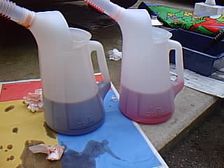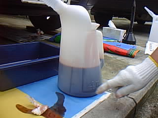抜いた量が「だいたい」では意味がないのでジョッキで計測。これは廃油専用の計測用ジョッキです。茶色いですね〜黒いですね〜。 |