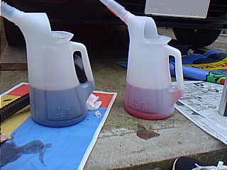 で、これが2回目の廃油と新しいオイルの比較。1回目と2回目は殆ど違いがなかったんだけど3回目はもう金属粉が見られず透明度も高くなっていました。全部で6リットルほど入っているというATF、一度に全部を抜けないので最低3回はやった方がいいそうです。家のも3回やりました。 |