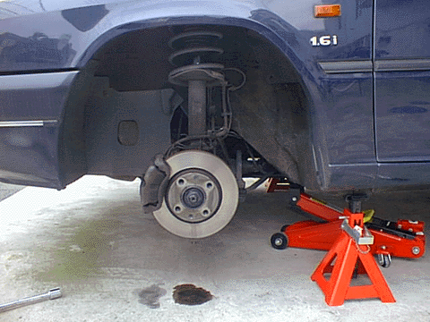 反対側も同様にジャッキを当てて車体を持ち上げ、写真はウマを当てたところ。基本的にジャッキアップはこれだけ。ポイントさえ判れば案外簡単な〜のね。これで色んな事にトライ出来そうな気になってきます(^O^) |