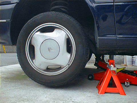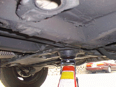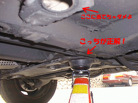 運転席側Fタイヤの後ろから前方を見てこのやうにジャッキを当てますのん。ジャッキを当ててるこの平たいところは、フロントサスペンションサブフレームを固定している外側のボルトのあるところ。このサブフレームの真ん中に当てると折れちゃうのだそうで(^^;手前に見えるいかにもジャッキ当てたくなるような所もNGなんですって。こうしてまず片方を持ち上げウマをかませます。 |