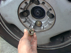 こんな事ならジャッキアップ前にボルト緩めるんだった〜(笑)我が家のZX号は何故かSUPER用のアルミを履いているためかホイールキャップをマイナスドライバーでこじって開けてみてビックリ〜。今までナゾだった付属品もこれで解明です。ごらんのとおり、ロックボルトが付いていたんです〜!いやぁ〜日本でZXのホイール盗むような人いるとは思えないけどフランスというお国柄なんでしょうかねぇ?? |