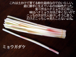 今日は帰る予定だけれど、都内の渋滞を避けるために夕方以降に出発しようとおばさんのお宅へ寄る。近くに大きいスーパーが出来たというので見物に行くことにした。なんでもあるいまどきの店で、こっちでいえばイ○ンが1フロアーになったって感じ!?ブラブラしーちゃんとまわっていると時々わからん食材に出会った。なかでもコレは初めて見た・・・ミョウガダケ。普段ミョウガと言っているのはハナミョウガでツボミと苞の部分なんだって、ミョウガダケはその前の新芽なんだって。これを取ってもハナミョウガは生るらしい。だんだん楽しくなってしっかりカゴに大きなズッキーニ、山菜、お菓子、酢・・・普通の買物してました。レジ脇で氷を沢山もらってくればクーラーボックスでOKだもんね。いやあ車で来た甲斐があった。地元のスーパーを覗くってのは旅の1ページにオススメです。